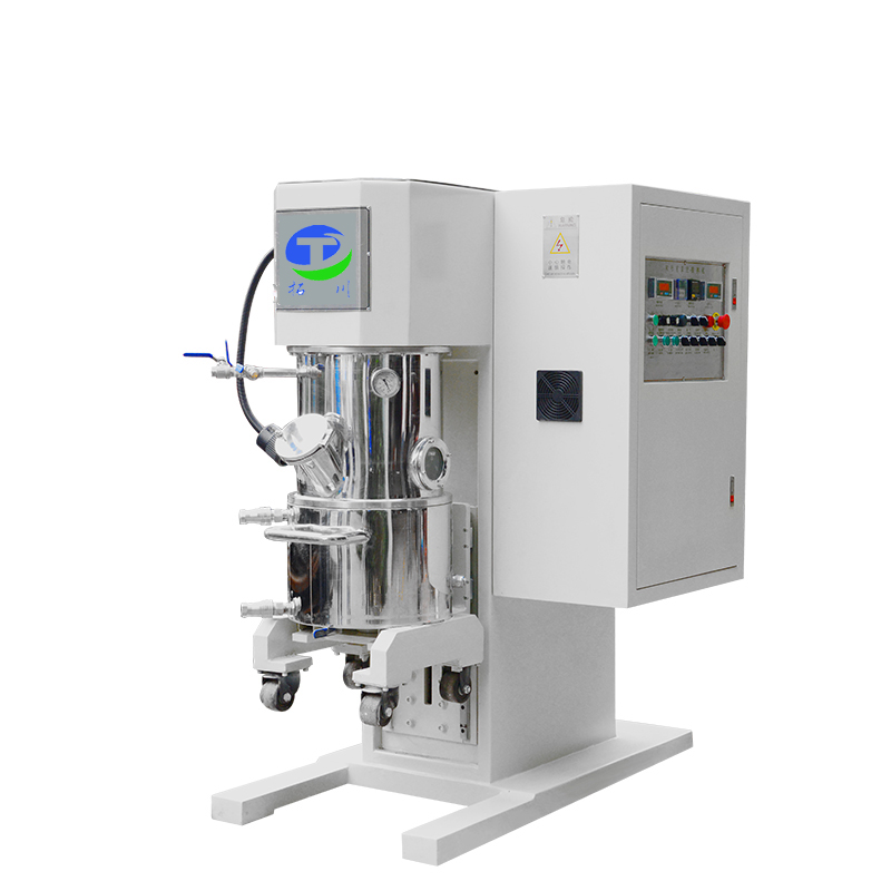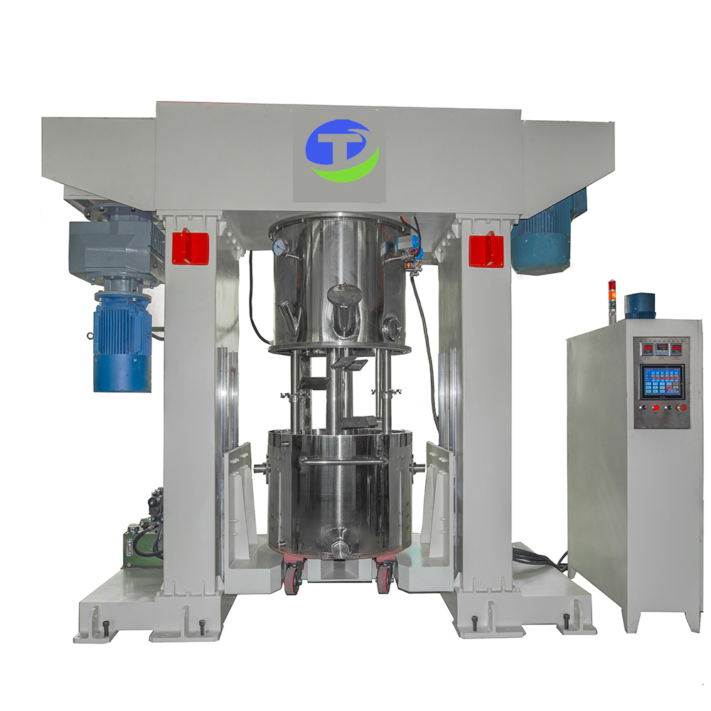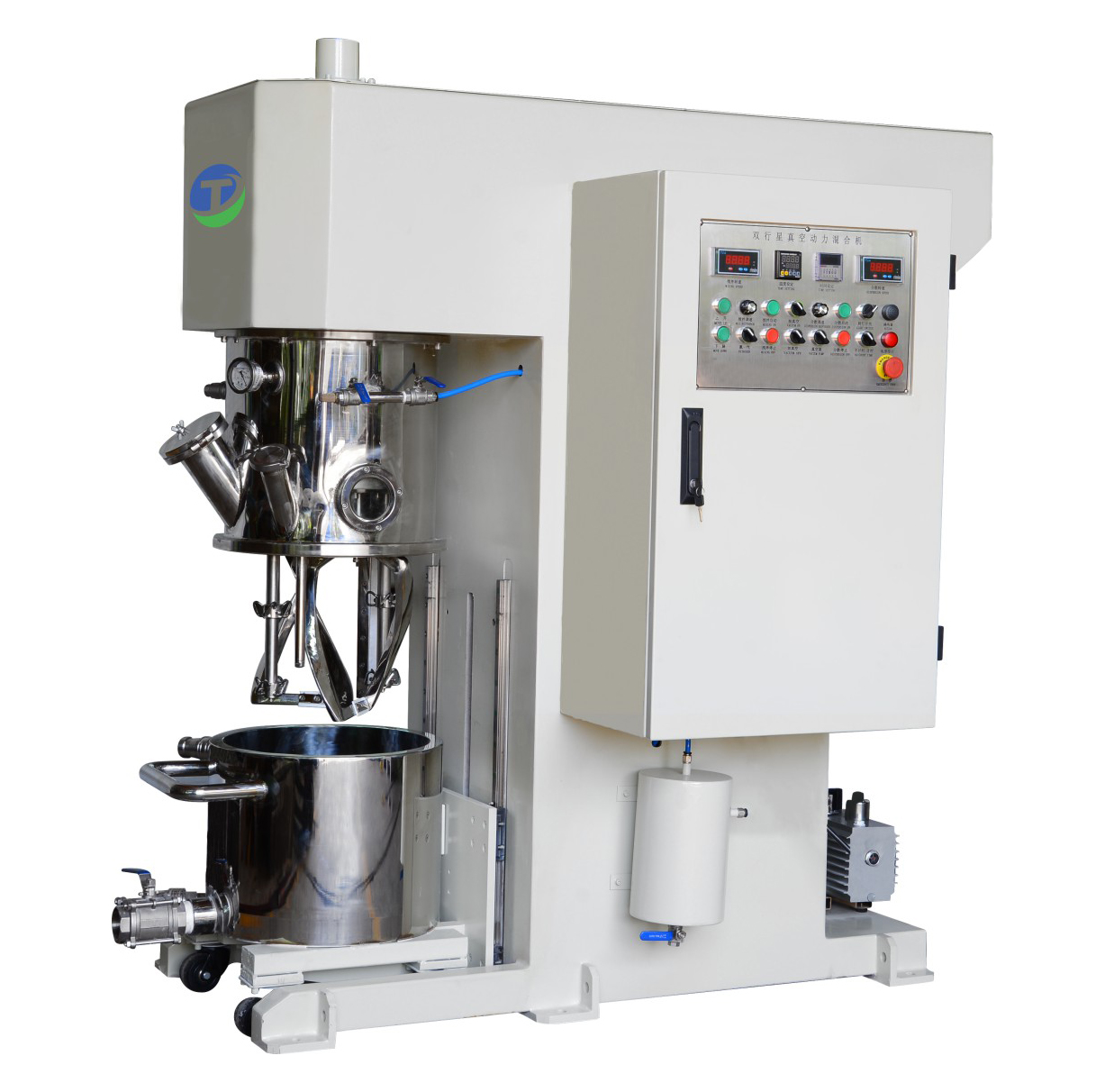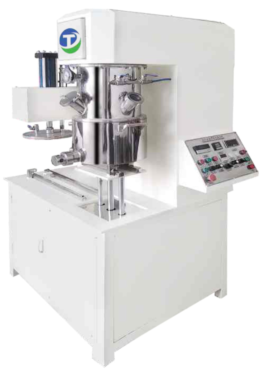 行星攪拌機(jī)通常有2個(gè)或3個(gè)多層折頁(yè)式槳葉,槳葉在公轉(zhuǎn)的同時(shí)也自轉(zhuǎn),使物料上下及四周流動(dòng),從而可在很短時(shí)間內(nèi)達(dá)到混合效果。 行星攪拌機(jī)